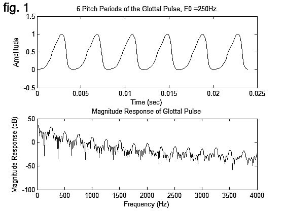 the first step of my project involved developing a better understanding of the human voice, and researching possible methods for synthesizing vocal sounds. the human voice produces sounds via a few methods. when the vocal folds vibrate, they produce a "glottal pulse wave" (fig. 1). this wave has relatively even harmonic content across the frequency spectrum, with a slight dip in the higher frequencies. in addition, turbulence that occurs as airflow is constricted at various points in the vocal tract (i.e. between the top and bottom teeth) produces fricatives. these sounds are then filtered by the vocal tract, the shape of which is manipulated to produce resonant peaks in the frequency response of the tract. the tongue, soft palette, and lips all play a crucial role in the manipulation of these peaks, which are commonly referred to as formants.